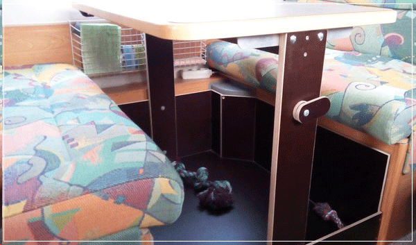 Da wir die 4er Dinette zum schlafen nicht benötigten, bot sie sich zum Umbau als Hundeschlafplatz unter dem Tisch an. Da es sich bei dem Tisch um einen Hubtisch mit einem Stahlgestell handelte, musste ein komplett neuer Unterbau erstellt werden. Ein guter Freund ist Tischler und ihm steht eine gut ausgerüstete Tischlerei zur Verfügung die den Bau des Unterbaus für den Tisch wesentlich erleichterte. Als Tischplatte wurde die des Hubtischs verwendet.